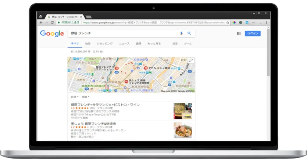 現在Google Mapsの表示枠は、オーガニック検索(SEO)よりも高い位置に表示されユーザーの目に止まりやすくなり、MEOとも連動するためSEO (ホームページ)にも良い影響を与えます。