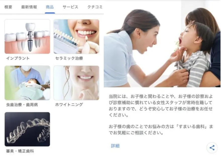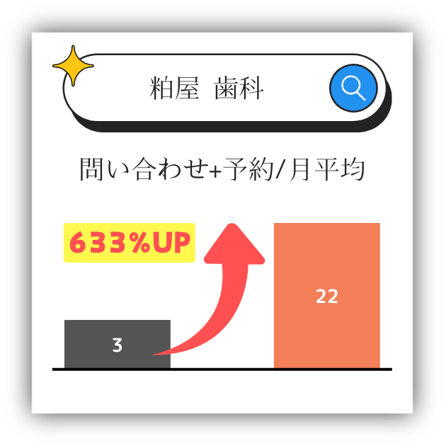 例→「地域名 歯科 インプラント」「地域名+歯科 子連れ」「地域名 歯科 ホワイトニング」などお好きなキーワードを入れ、ライバル医院よりも上位表示させることが可能。
