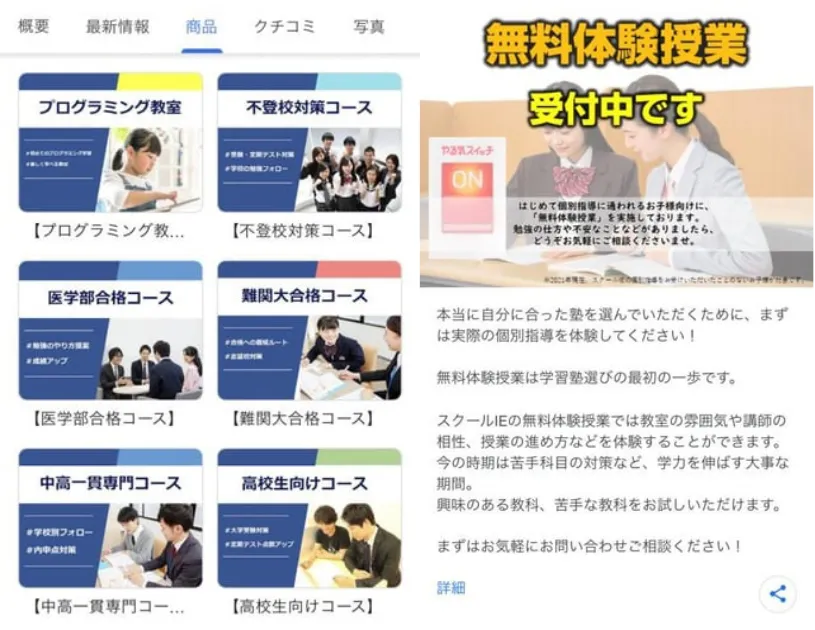 商品にコース、サービスに具体的な説明を入れて知りたい情報を見れるようにします。キーワードを散りばめることで上位表示も狙えます。