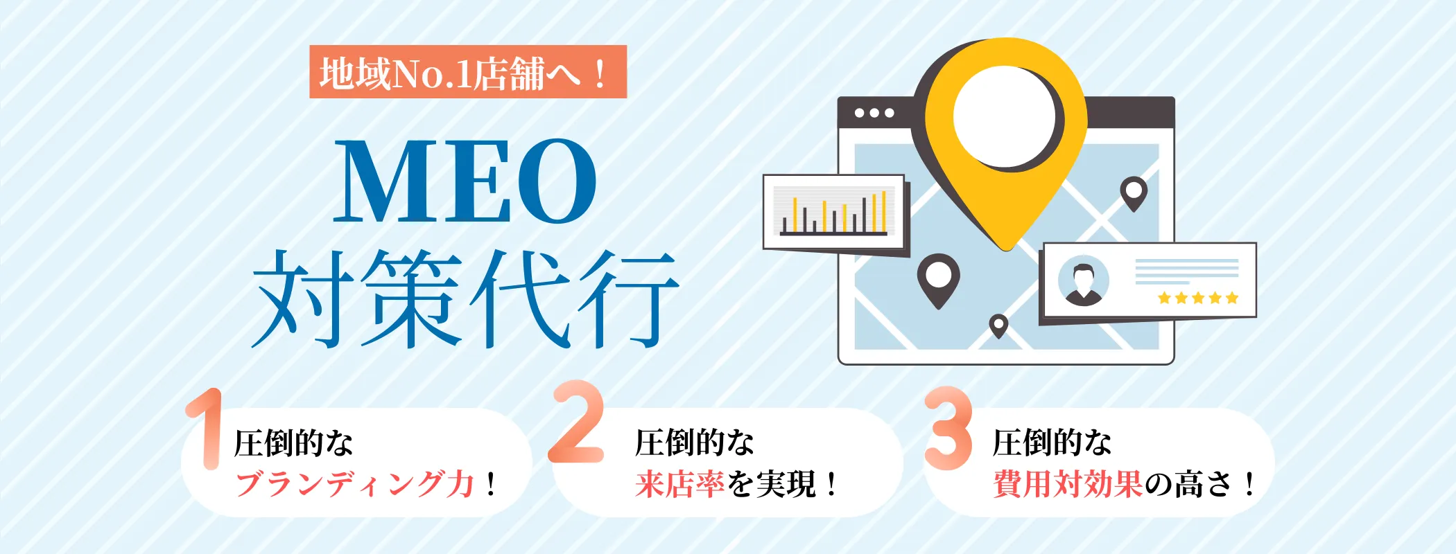 SEO対策やリスティング広告は約10万~50万/月かかるところ、MEO対策は月に約2万月~とリーズナブルな費用で集客が出来るので費用対効果が高いと言えます。